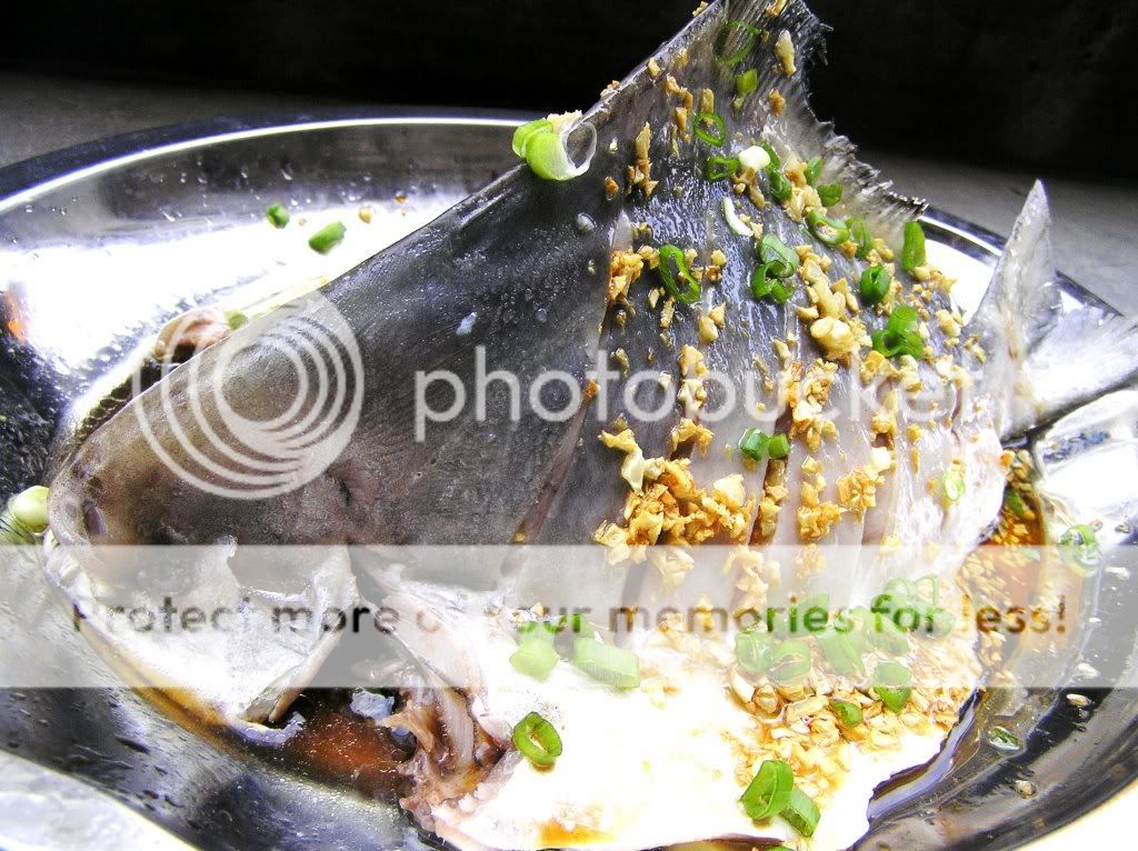 3。取出蒸好的鲳鱼,将蒸汁隔离倒入碗中备用,乘蒜米油在高温的时候,淋上鱼身(油量要多,足以淋透鱼身),将油倒掉,倒回鱼汁,加入自制酱油,青葱即可上桌。