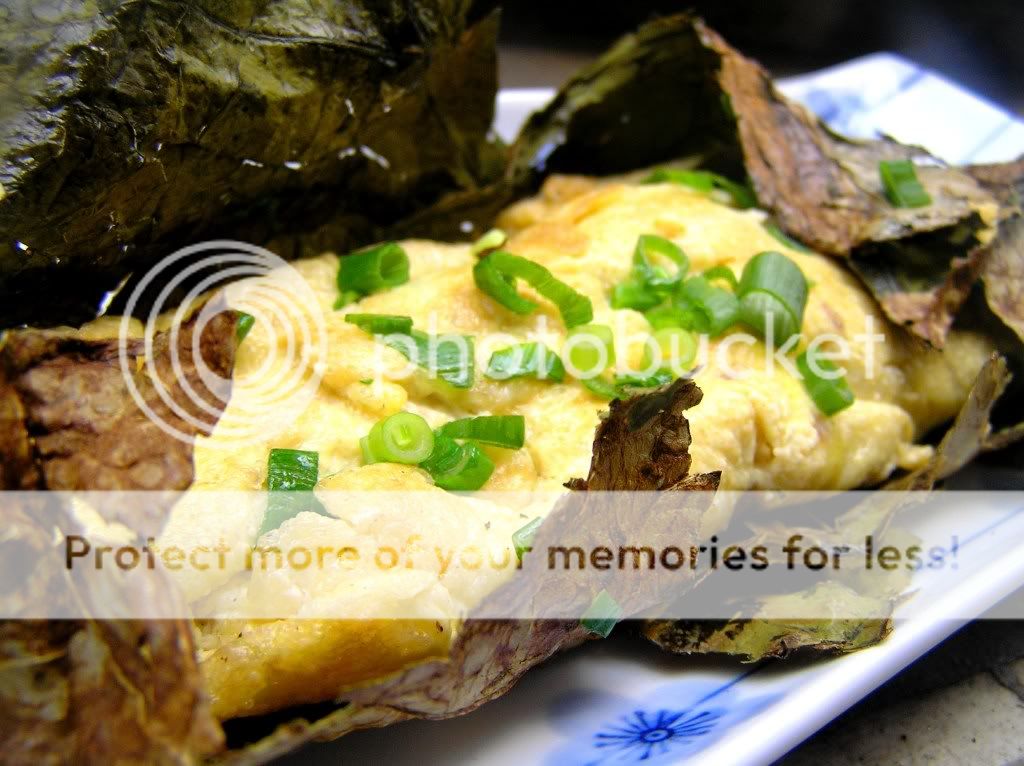 5。将下薰好的荷叶包扎煎好的蛋煎蛋,放入青葱段即可上桌。
