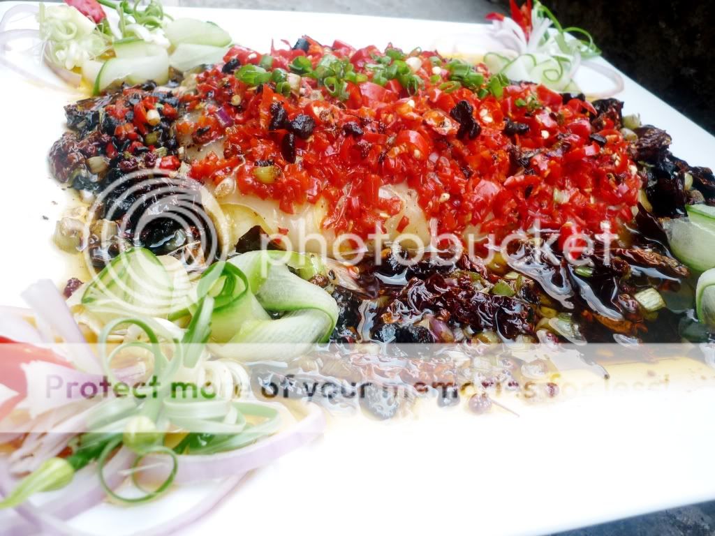 2. 起热油锅,爆香花椒,黑豆四,辣椒干,洋葱粒, 取出蒸好的鱼,淋上鱼面即可.