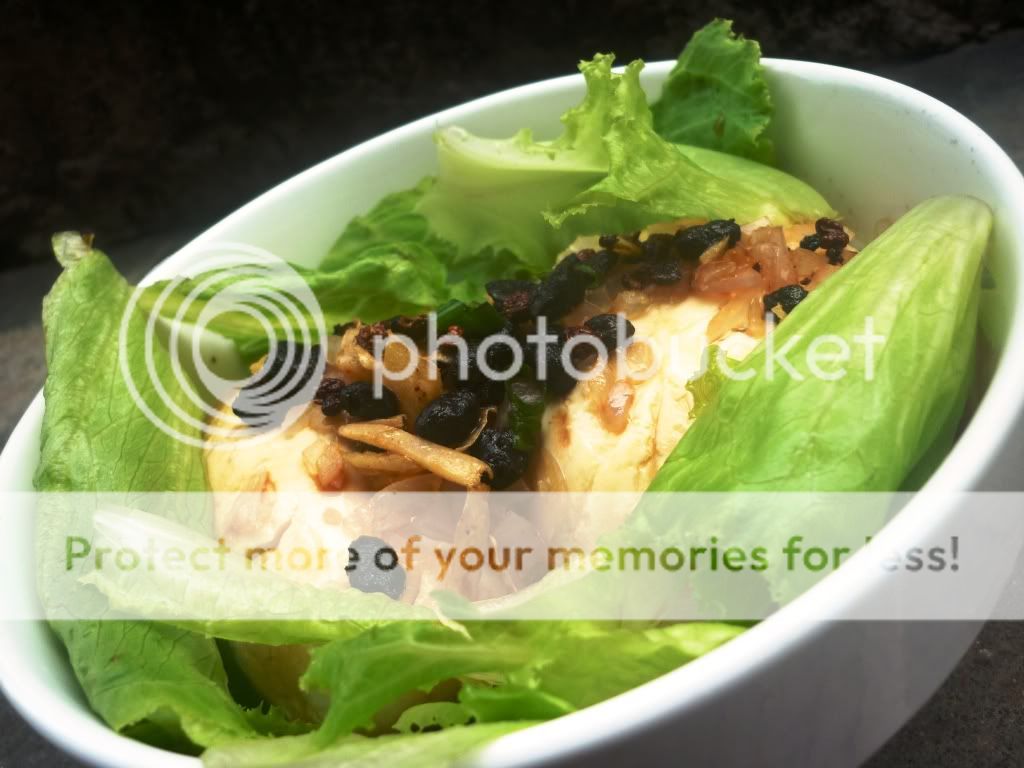 4.将生菜包扎则豆腐边,撒上青葱,和指天椒少许,即可上桌.