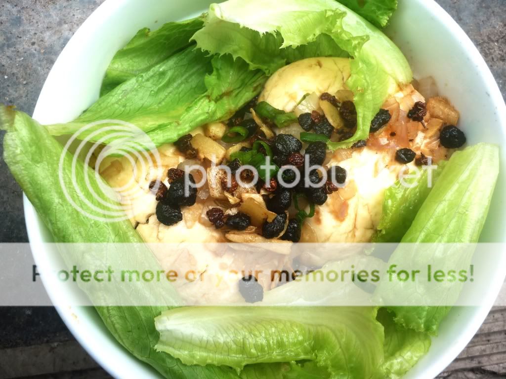 [材料] 有机豆腐(粒状) 2粒,生菜,洋葱2粒,黑豆酱油,食油,海盐,青葱,指天椒,花椒,生姜丝,黑豆四.人参鸡汤(高汤)