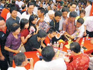 “粉絲”爭索林冠英簽名 身為檳州首席部長的林冠英在吉打也有很多“粉絲”,這場政事講座形同巨星會影迷,入場之後人人爭前索簽名,主持人喊停一陣,進入休息籌款環節,人群再度持印有林冠英肖象的“火箭產品”如聲帶、雜誌、報紙等湧往前座,有些甚至拿出皮包、布料等,硬要林冠英簽名。