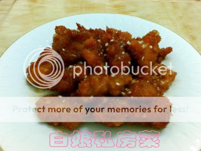 沥干油。干净锅下1汤匙油,爆香蒜碎,下调味料,煮滚至浓,试味,下炸肉,快速拌