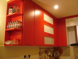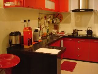 当时我选深红色的壁橱+黑色table top,给很多人念. 幸好效果出来不错. 很Modern的feel.