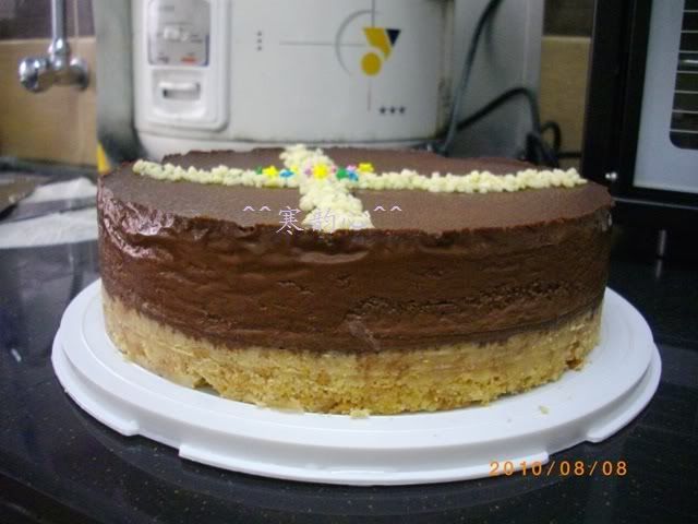 4. 取出刚才的蛋糕模,把芝士糊倒入饼底上,隔水烘烤150度,60分钟。
