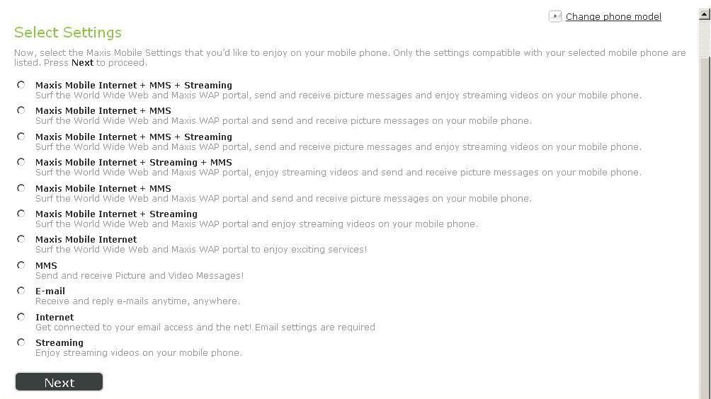 4. 然后, 选择你要的settings. 如果你3G上网等一切正常, 你就可以只是选择MMS. 按右上角Change Phone Model可以选择你的手机,如Nokia N8