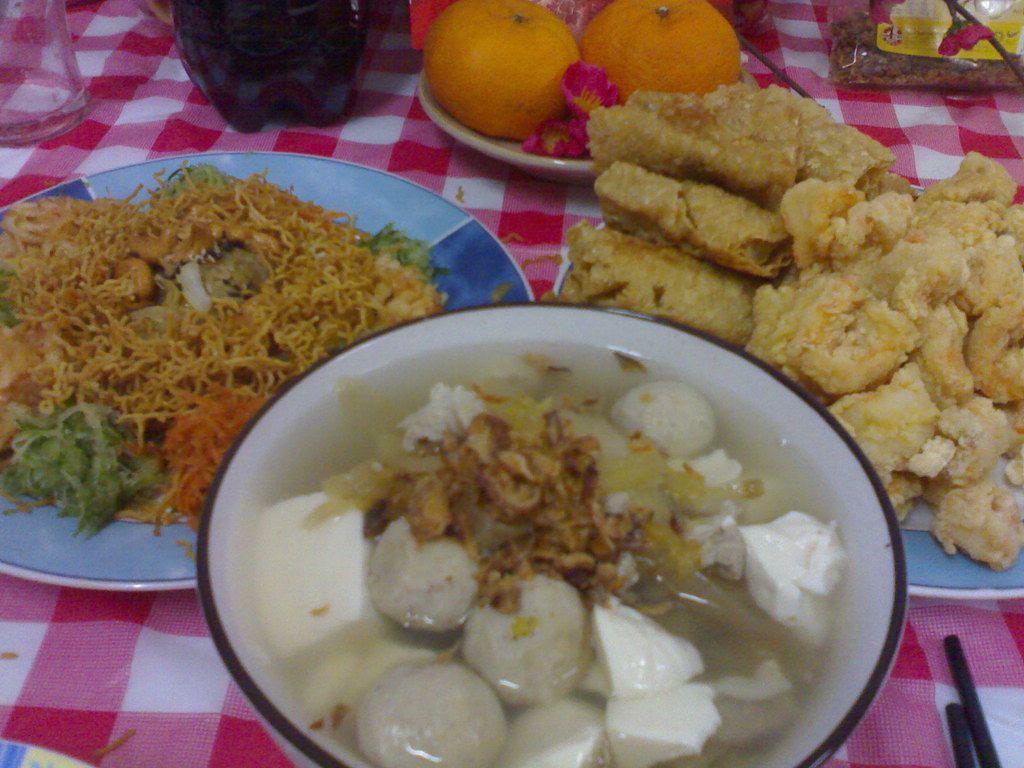 2。水煮滚,加入水梅和咸菜,猪肉片煮10~15分钟,加入肉丸和豆腐再煮滚便可熄火。