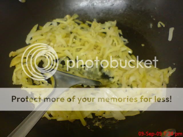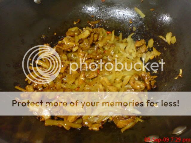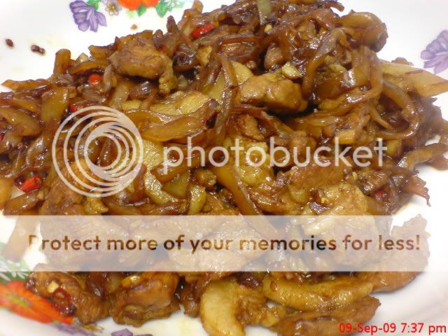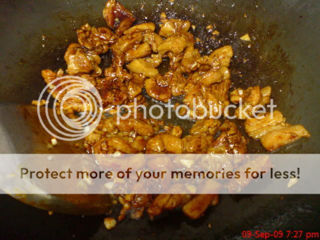 爆香蒜茸后,倒进花肉,加些黑晒油炒到香.