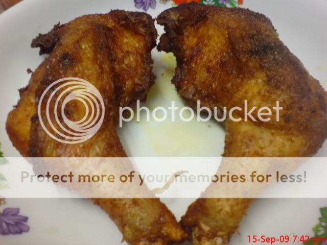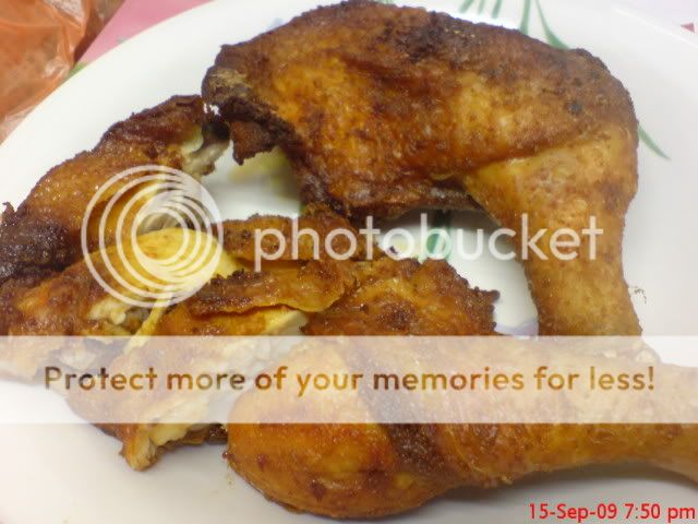 原本要弄南乳炸鸡的,但当我腌鸡腿时闻到那罐我买了快两年的南乳好像已经变了腐乳的味道了,立刻将鸡腿再洗干净,待干后,只涂上咖哩粉和少许的盐.腌了一个晚上的鸡腿在炸时已经可以闻到很香的咖哩味了,一人一只鸡腿,不用争,哈!