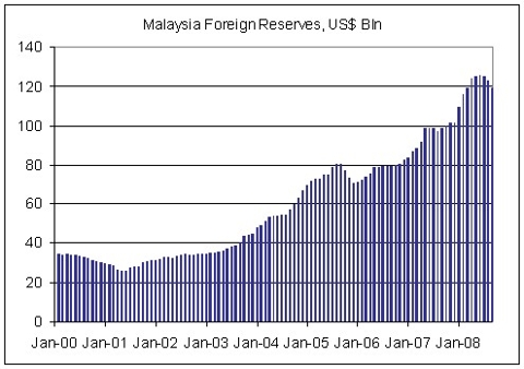 As at Sept 30, 2008, BNM’s foreign reserves stood at RM379.3 billion (US$109.7 billion), versus the peak at RM408.5 billion as at July 31, 2008.