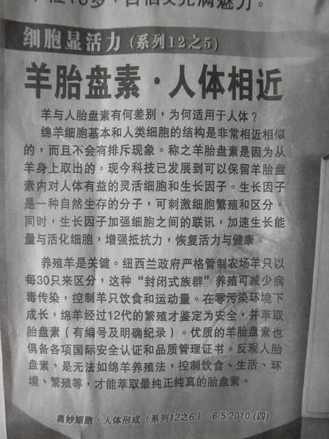 回顾上述历史,坦白说,纽西兰医学界不曾在全球医学文献发表过关于“羊胎素”或胎盘素的研究报告,所以我很怀疑它们是否拥有安全生产这些动物细胞物质的技术,无论如何,消费人可以亲自致电卫生部查询产品的来源和成分以策安全,毕竟目前很多人喜欢打着西方国家的名义牟取暴利,所以为了不被欺骗也为了安全,应该费点时间查证一下。