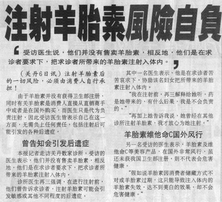 但有諸多隱患的羊胎素在香港的市場並不小。不少演藝明星還公開為其捧場。“羊胎素盡管很貴,但不少香港人還是舍得去打。當然,富豪們打的更多些。”王女士感嘆道,做美容還真大意不得,稍不留意,就把一生都毀了。