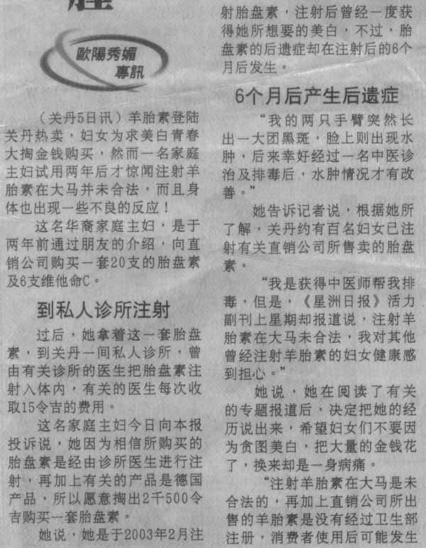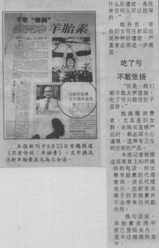 有时候大量的宣传会让人忘记了事实求实,所以我也只是凭我的工作经验提醒一下而已 在亚洲很多人开口闭口都是羊胎素,但没有人知道所谓的羊胎素,干细胞,活细胞究竟是什么,结果就被某些无良美容师骗了,花了很多钱买到便宜的胎盘素,却以为买到了活细胞。。。无论如何,从zell-V的广告看来,他应该在卖着口服的胎盘素,虽然我有点质疑纽西兰是否具有安全提炼胎盘素的技术,但如果卫生部能够证明货源来自纽西兰,又有MAL核准编号,价钱又不贵的话,应该没有问题吧 但是看到那几个代言人,我相信价钱一定不便宜 如果哪胎盘素食注射剂,就得小心检视他的MAL 编号, 合法注射针剂的编号是MALxxxxxxC 或AC, 如果不是C或AC,就有使用假编号欺骗之嫌,就像之前Dr Nano的减肥针剂一样,使用MALxxxxxxK (外用) 的编号而受取缔,所以网友在购买这些产品前一定要小心检查一策安全。