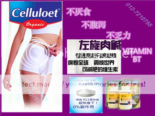 Celluloet产品, 0%药物,0%副作用, 绝不会心跳加快, 不会口渴, 不会头昏, 不会失眠, 不会乏力, 不会便秘, 因为我们产品不含一点药物!无论是男女老少。糖尿病者,哺乳中的妈妈,高血压者都可以放心的服用。。。 |