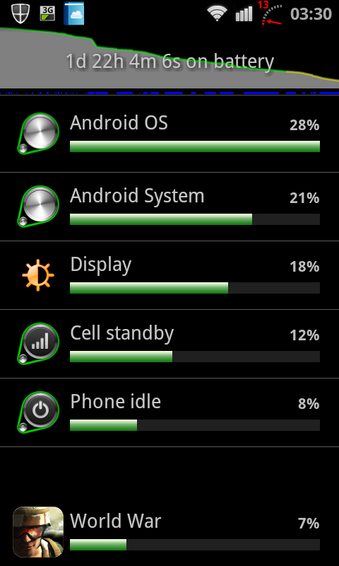 这个是 LeoMar75 v2.4 + Lulz Kernel XXKG6 + JuiceDefender ultimate 的效果。当然,我这两天也很少通话跟上网。偶尔也是 FourSquare 下,World War 下,SMS,Call 一下而已。 |