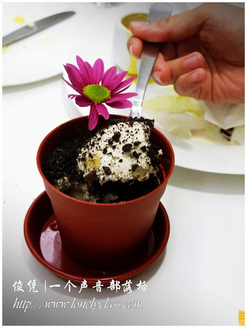 当服务生捧出两个分别插着黄色和紫色菊花的小花盆出来时,我还以为是想拿来装饰。但是,服务生说那两盆花是甜品时,真的令我满腹狐疑。原来,这是经过厨师多方面的参考后设计出的起司杯。我很肯定这起司杯一定会受到很大少女的喜爱,因为实在太梦幻了!原来起司蛋糕就藏在“沙土”(巧克力碎)之下,这也太巧妙了吧!