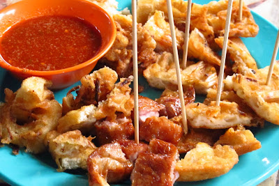 在姓氏桥的外边有有一档香蕉糕非常好吃,很多人都会来这里买。走入姓陈桥旁,有一个卖虾煎的档口,虾煎卤肉馅料够之外,最重要是辣椒弄得很好味,配着香脆的虾煎,非常好吃。啊,老板娘也叫我们一种比较特别的吃法,就是将黄面卷在虾煎上吃,口感更丰富!所以,在这里买虾煎的话,老板娘都会问要不要黄面,所以不要出奇哦!