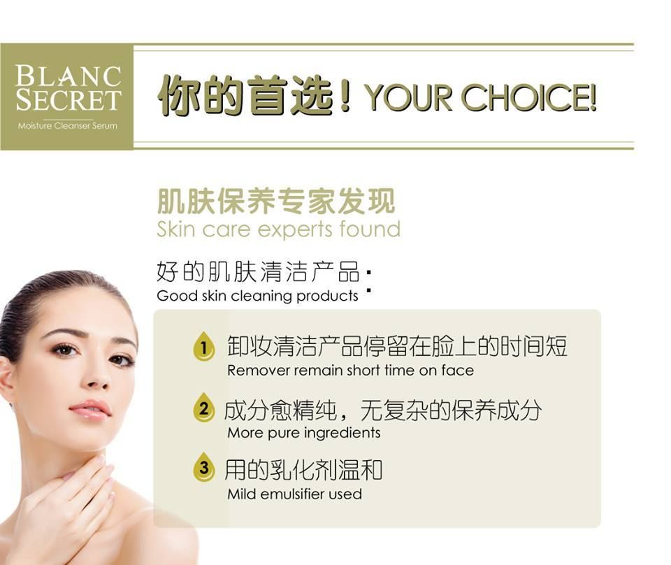 BLANC SECRET肌肤保养专家发现,由于卸妆清洁类产品停留在脸上的时间很短,无须加入太多复杂的保养成分,成分越精纯,用的乳化剂越温和,就越是好的肌肤清洁产品!