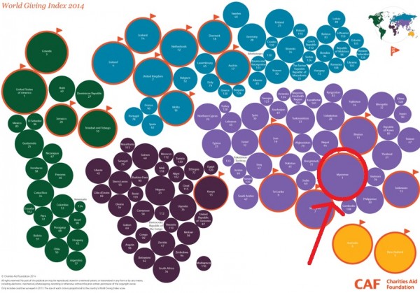 報告顯示,緬甸人口中高達91%會從事志工工作、49%會捐款給慈善機構、另有51%樂於幫助陌生人;美國則有68%會從事志工工作、79%會捐款給慈善機構、另有44%樂於幫助陌生人,兩國的全球慈善指數同為64分,並列第一。