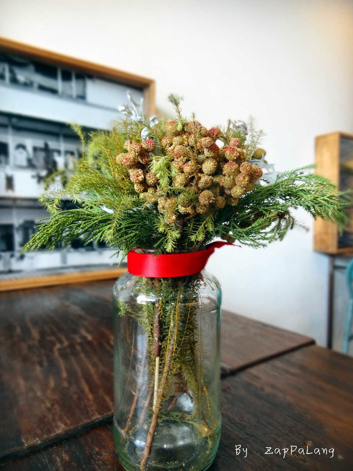 推开咖啡馆的玻璃门,里面白色和墨绿色的配搭特别有圣诞节的气氛。店里用了大量的假花和假草来增添绿意,还有一面挂满绿色植物的墙,加上零星的灯光,晚上应该会很漂亮。