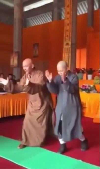 影片中,比丘與比丘尼站在佛堂中間,一邊唱著「123,你是佛,123,我是佛,123大家都是佛,南無阿彌陀佛。」一邊拍手跳舞,兩人還面對面擊掌,原本莊嚴的禮佛儀式,頓時之間變得活潑,也逗得場邊信徒哈哈大笑,氣氛相當歡樂。