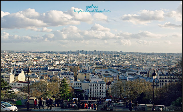 我们沿着斜坡悠闲地往上走,看看风景、拍拍照。到了一定的高度,一个回头,看到巴黎市区就在远处,灰白乳黄的建筑盖着巴黎招牌的蓝屋顶,笼罩在一片温煦的阳光下——这种景色岂不醉人?