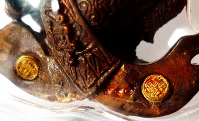| 背面是必打佛 (遮面佛)和双枪(避险和避官非),此牌乃由独特硬币铜金属料加FARBART料所督造(Farbart是泰国僧侣用来放善信供养饭菜之托钵的盖子),这个盖子每次打开使用前,僧侣都会诵经祈福,所以长期吸收了很多颂经的力量,用来督造佛牌必定灵验无比,能使佩带者带来找吃容易的功能,有贵人扶助的意思,也属限量版3000粒 |
