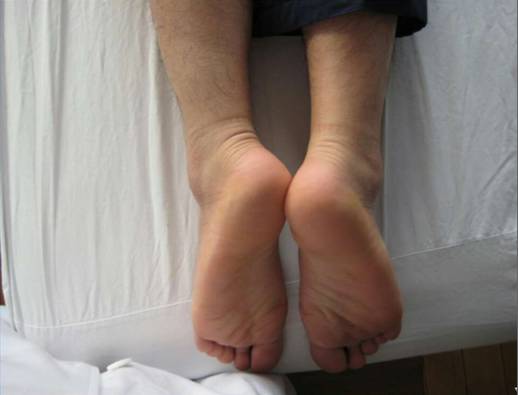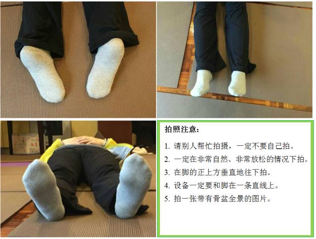 就是平卧自然放松时,两只脚不能对称地向两边分开,而是一边往里摆得多,一边往外摆得多。