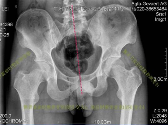 通过片子也能发现骨盆偏歪的问题。即使大家不懂医学,但看看骨盆下面两个像眼睛一样的圆洞洞,是不是不一样大,髋骨两边像耳朵一样的骨头是不是不一样大,骨头最上缘是不是不在一条直线上,片子可以清晰地显示出来。