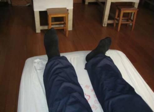 从他袜子的压痕来说,他的左侧脚底和右侧脚底脚掌着地的位置和着地的程度是不对称的,多数人都会伴随不同程度的腰腿痛。