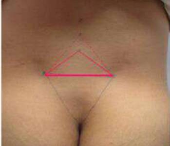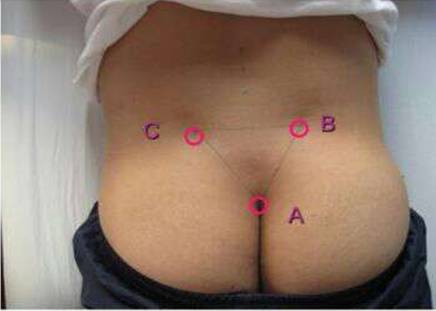 沿着屁股两边的小窝,类似小酒窝,髂后上棘在同轴中间,这三点之间的连线,正常人是等腰三角形,或等边三角形,但是如果发现骨盆旋移症的时候,三角形两边的腰就不等长。