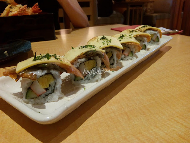我们也点了母亲大人受吸引的 Unagi Summer Roll。烤过的鳗鱼片配上芝士和饭卷,味道不俗。这样的搭配很合适,芝士丰富了整道 maki 的味道。