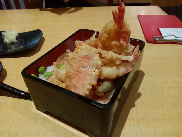 我们点了一个大份的天妇罗盖饭。端上桌的时候,天妇罗摆盘得很漂亮。天妇罗里有虾,番薯和羊角豆,味道 OK。天妇罗虾炸得不是很好,裹上了一层厚厚的面粉。比较让我不满意的是,这天妇罗没有萝卜泥来搭配,味道就好像缺少了一块。