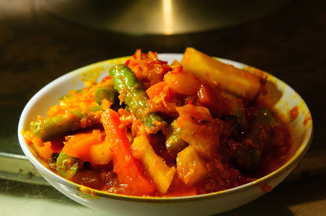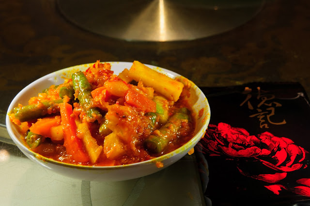 店家备有一个开胃小菜,阿扎。黄瓜、长豆和胡萝卜切成小段,并且配上阿扎酱。酸甜辣混合在一起,而且咬下去很爽口,真的是一个开胃的小菜。