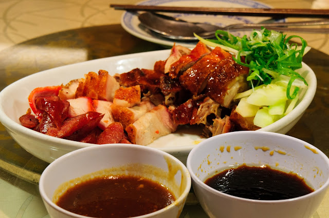 再来的是烧腊拼盘。一共有四种,包括烧鸭、烧肠、烧肉以及叉烧,旁边还铺有黄瓜和青葱花伴之。烧鸭和烧肠咸度和口感适中,还算不错。由于店家顾及养生的食客们,用上的叉烧都偏瘦,导致口感比较干涩。只有一些带肥的叉烧,口感方面比较好,可见肥瘦比例是何其重要。至于烧肉,就是肥瘦适中,味道在四个之中最好。