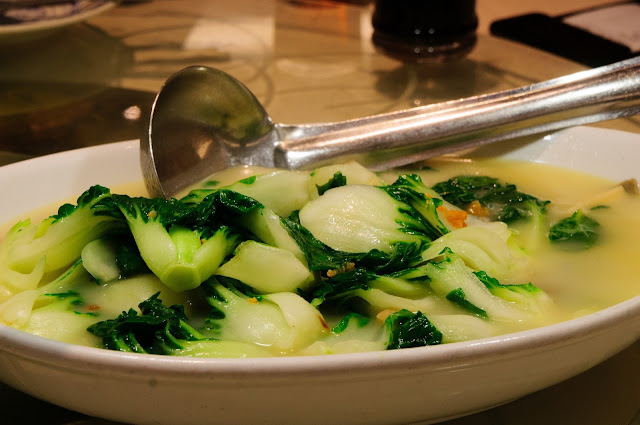 首先上桌的是上汤奶白。奶白浸在奶白色的高汤里,并且附有很多虾米。与一般不同的是,这里运用了虾米提味,而不是江鱼仔。由于高汤熬了很久,所以才会呈现奶白色,不用说也知道汤很够味,而且每一口汤都很有滋润的感觉。至于奶白,看起来翠绿,咬下去爽口。