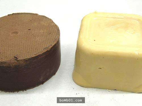 ▼在磨成可可膏的过程中,可可豆中的油脂也会随之被榨出来,经过处理之后,可可和可可脂就这样被分离开了!(左图为可可,右图为可可脂)