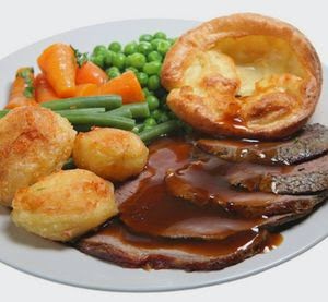 2. 烤牛肉与约克郡布丁 (Roast beef and Yorkshire Pudding)