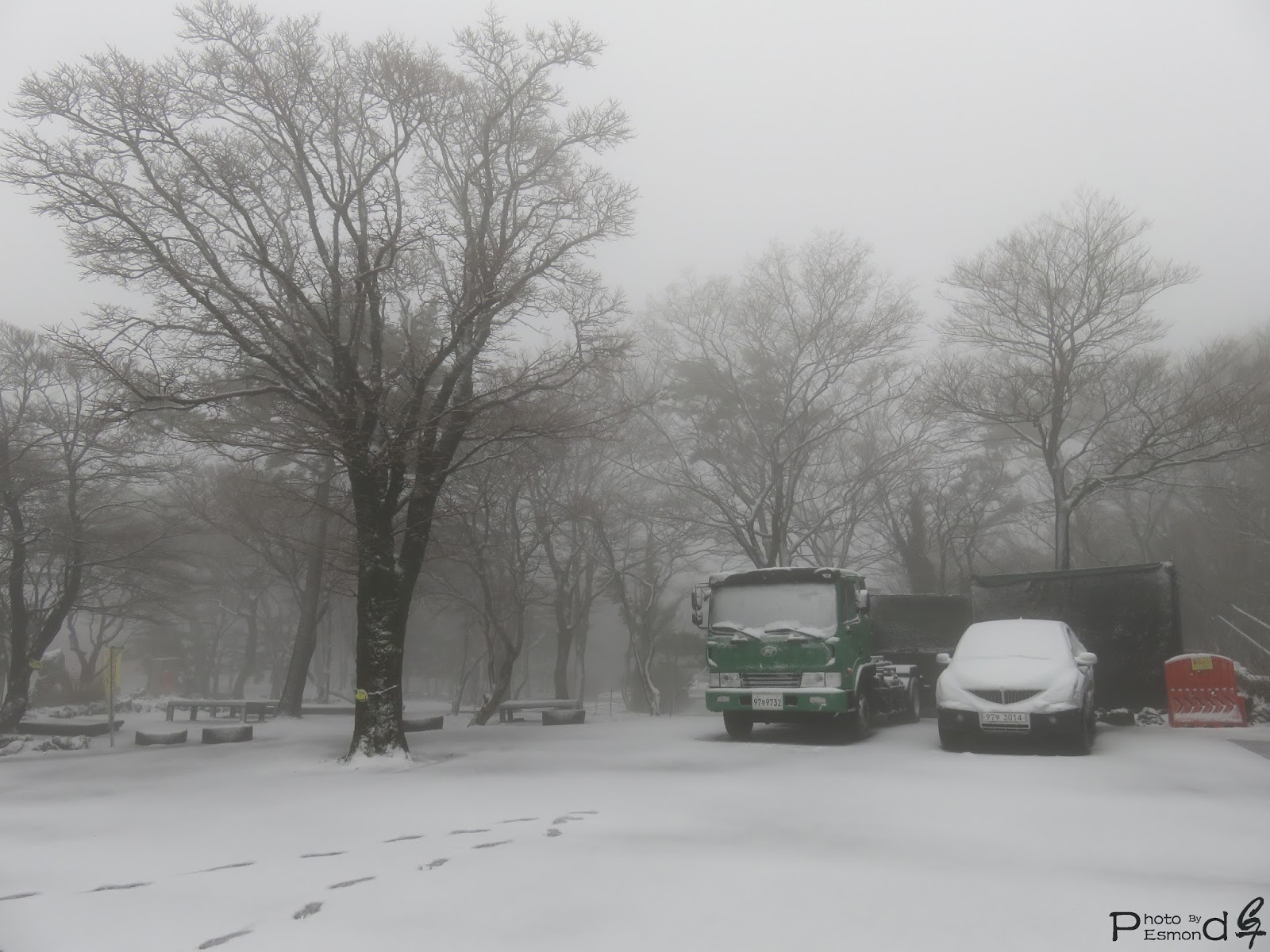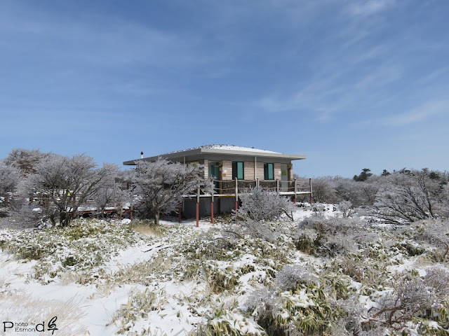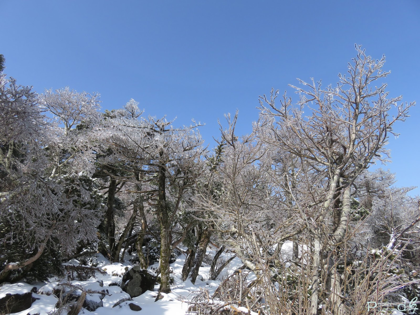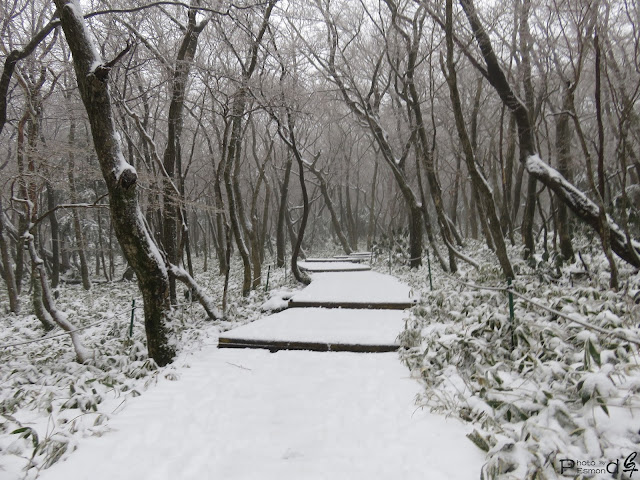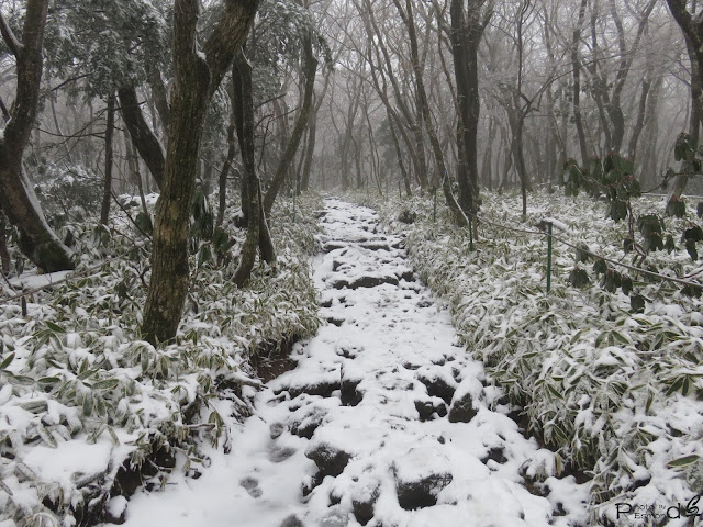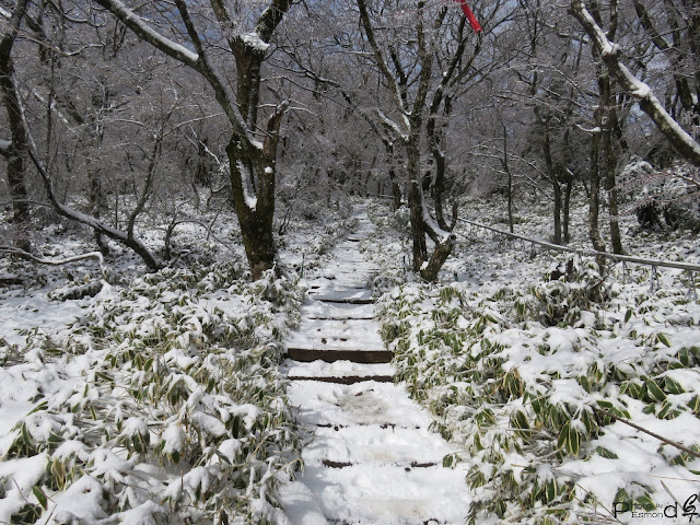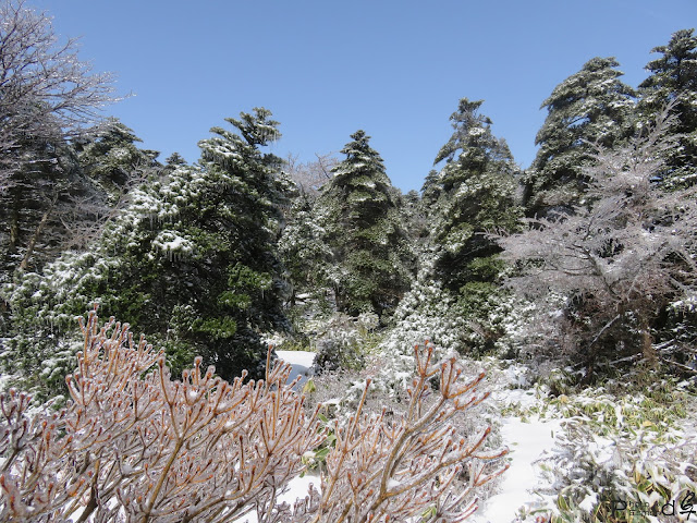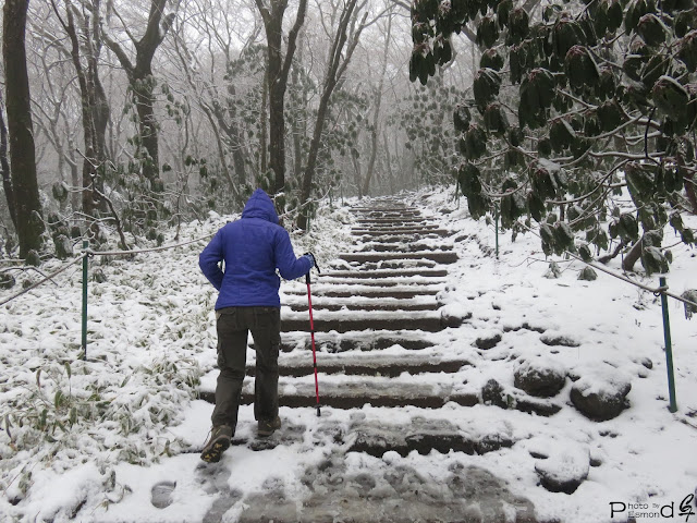 经过了杜鹃田掩蔽所后的山路,难度一下提升不少。这一段攻顶的山路变得很陡,就连我也不得不一直停下休息。这段山路,从掩蔽所去到顶峰全长2.3公里。在这短短的2.3公里,登山客需要从海拔1500米走到顶峰,海拔1950米,就在这2.3公里内需要提升450米的高度。。。虽然山路蛮陡,很吃体力,但是这段山路却因为下雪,有了积雪的关系反而变得容易了一些。