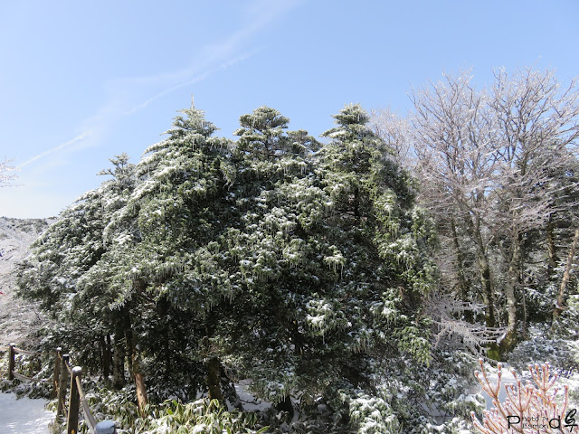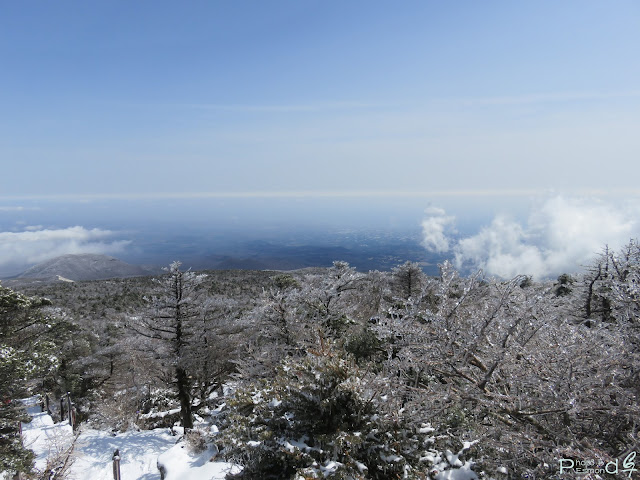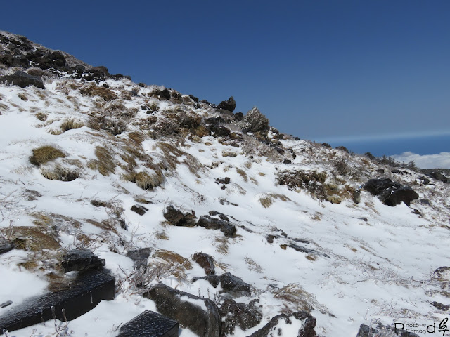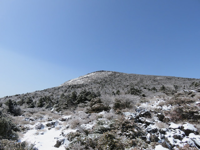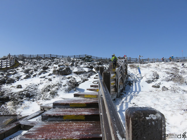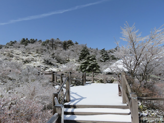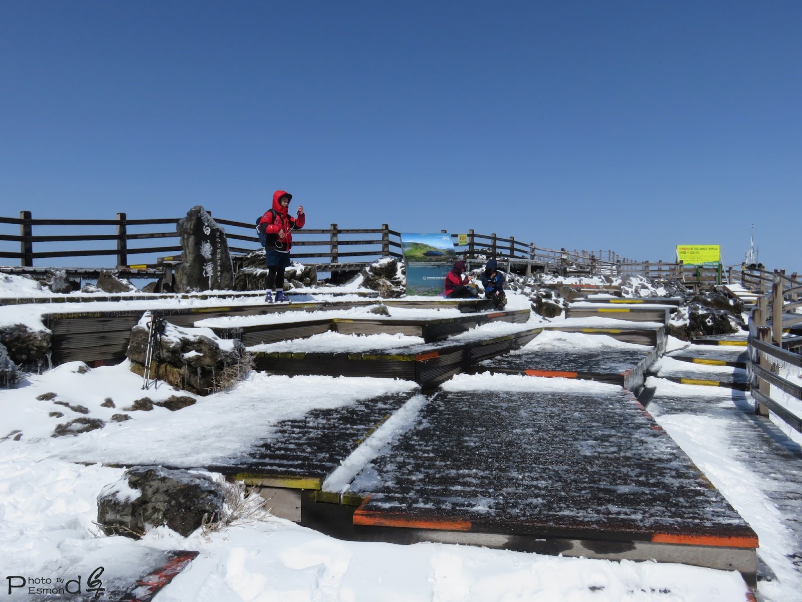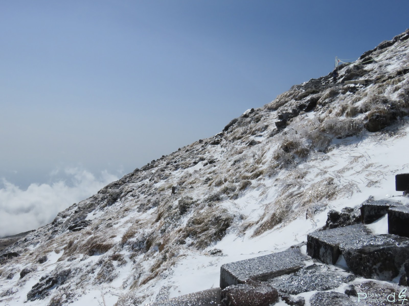 走着走着,我终于可以望到汉拿山山顶了!接下来的路就是沿着这些木制的梯阶往上走。这个看似最容易的部分反而是我全程攻顶最花时间的路段。原因很简单,这些梯阶上都结了一层薄冰,而我向住宿租借的雪爪碰巧坏了,我也没有拿珮珮的雪爪开始攻顶。现在我需要非常的小心一步一步的往上走,不然我很容易就会滑倒。