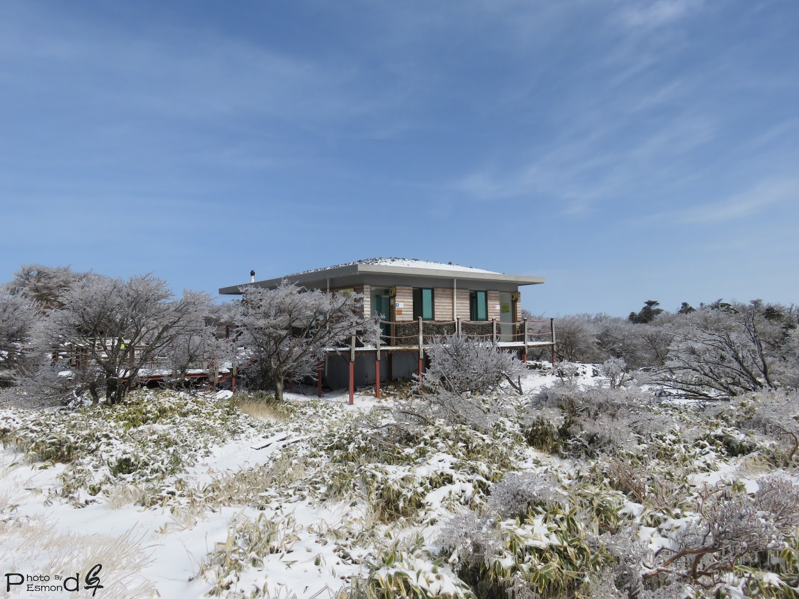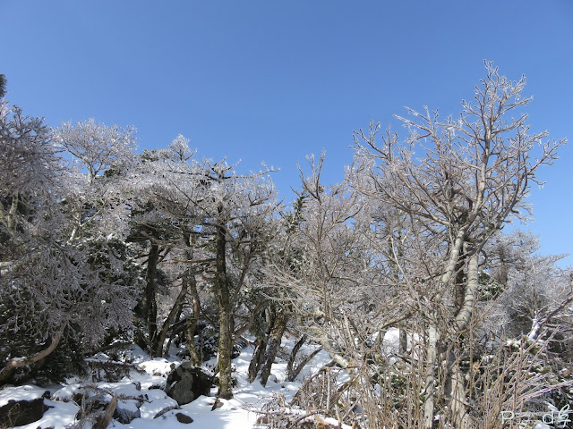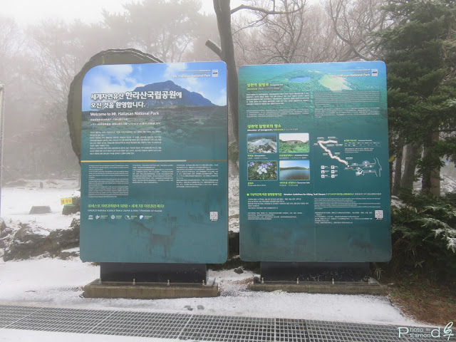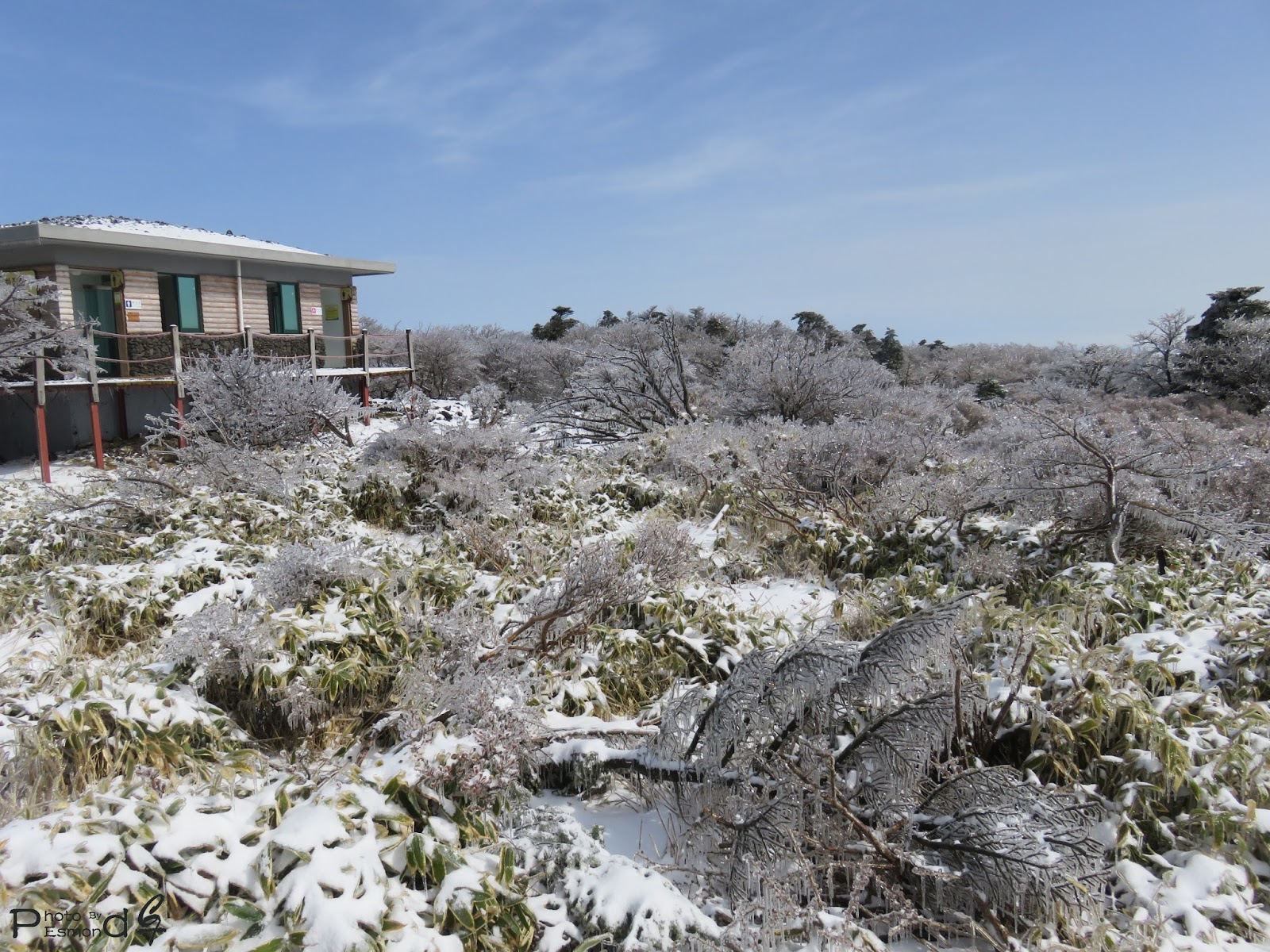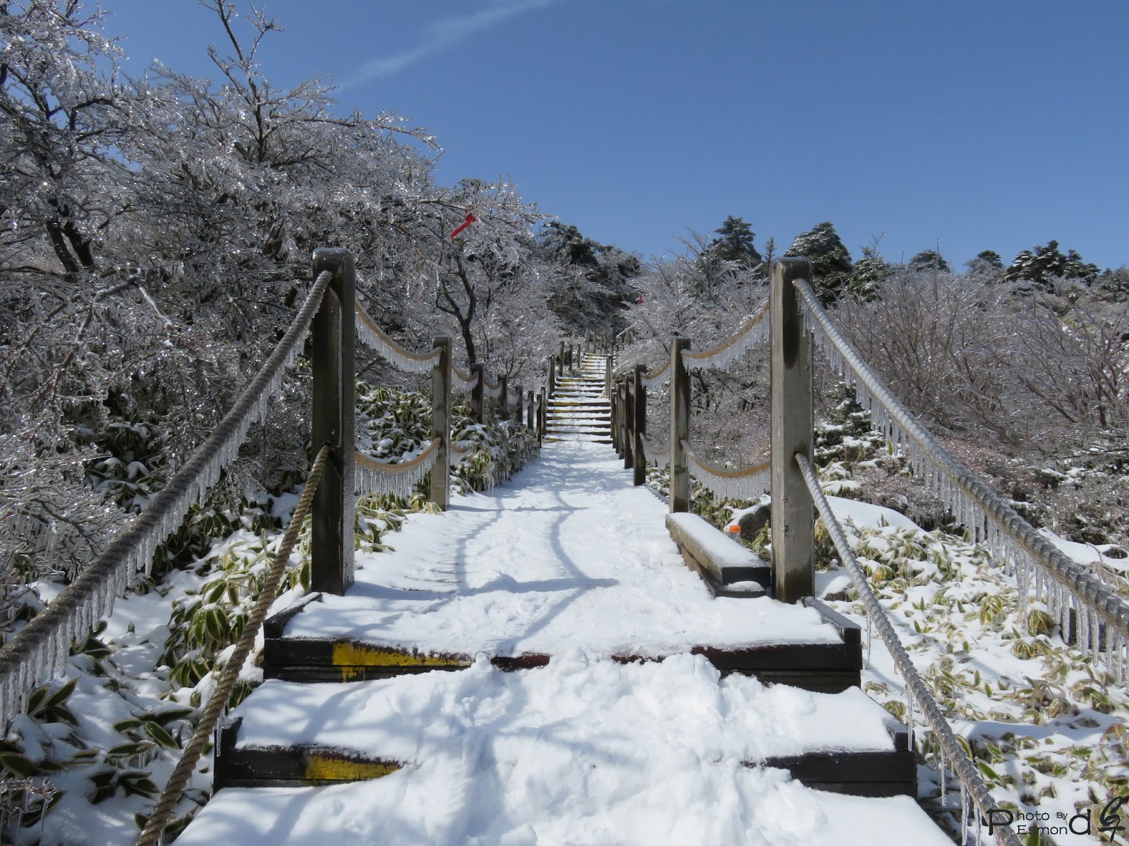走着走着,我终于可以望到汉拿山山顶了!接下来的路就是沿着这些木制的梯阶往上走。这个看似最容易的部分反而是我全程攻顶最花时间的路段。原因很简单,这些梯阶上都结了一层薄冰,而我向住宿租借的雪爪碰巧坏了,我也没有拿珮珮的雪爪开始攻顶。现在我需要非常的小心一步一步的往上走,不然我很容易就会滑倒。