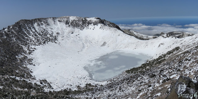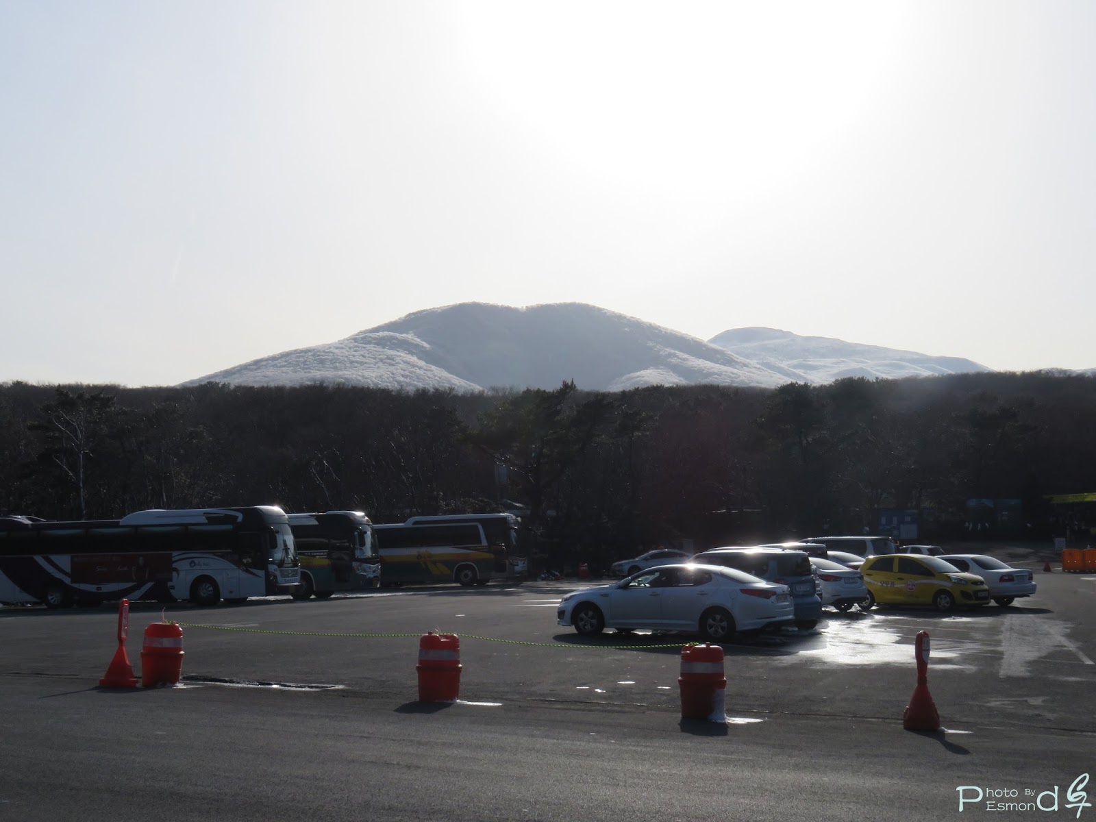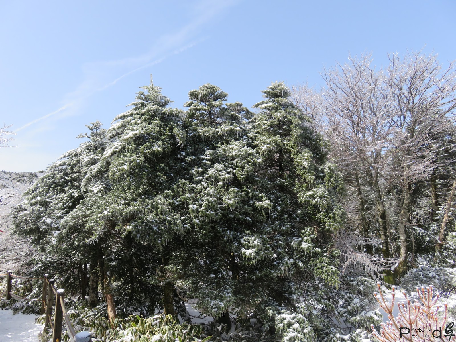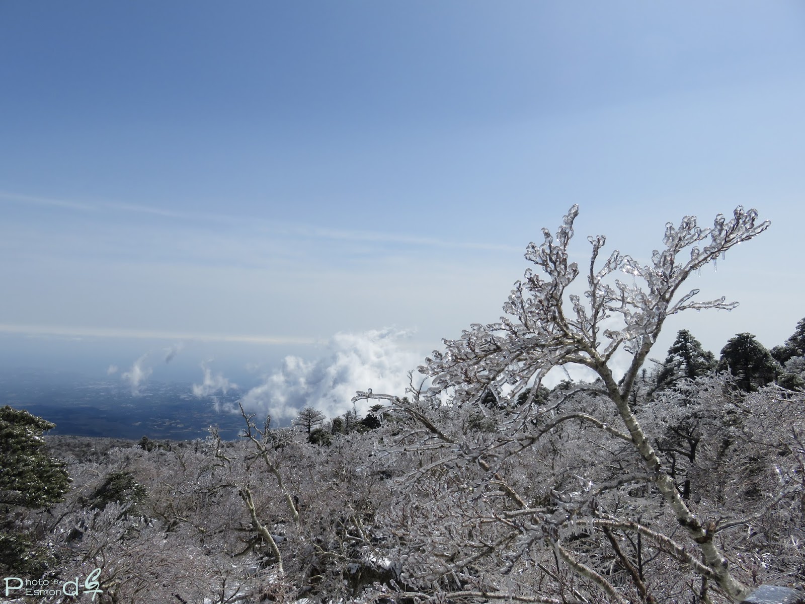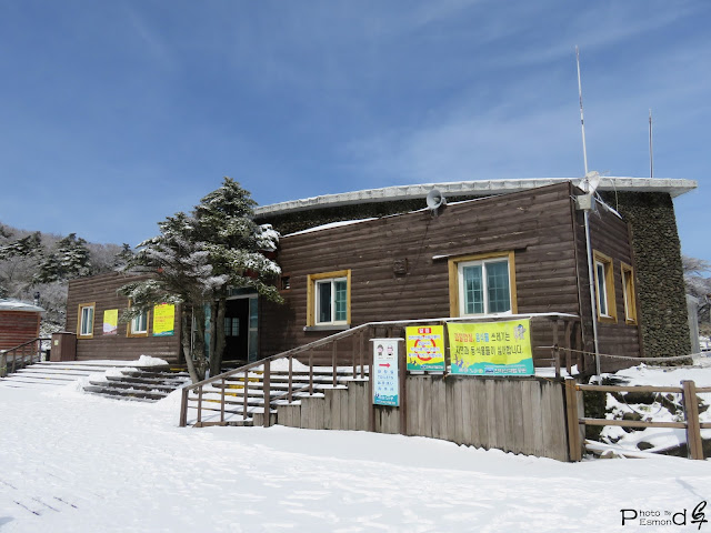 走着走着,我终于可以望到汉拿山山顶了!接下来的路就是沿着这些木制的梯阶往上走。这个看似最容易的部分反而是我全程攻顶最花时间的路段。原因很简单,这些梯阶上都结了一层薄冰,而我向住宿租借的雪爪碰巧坏了,我也没有拿珮珮的雪爪开始攻顶。现在我需要非常的小心一步一步的往上走,不然我很容易就会滑倒。