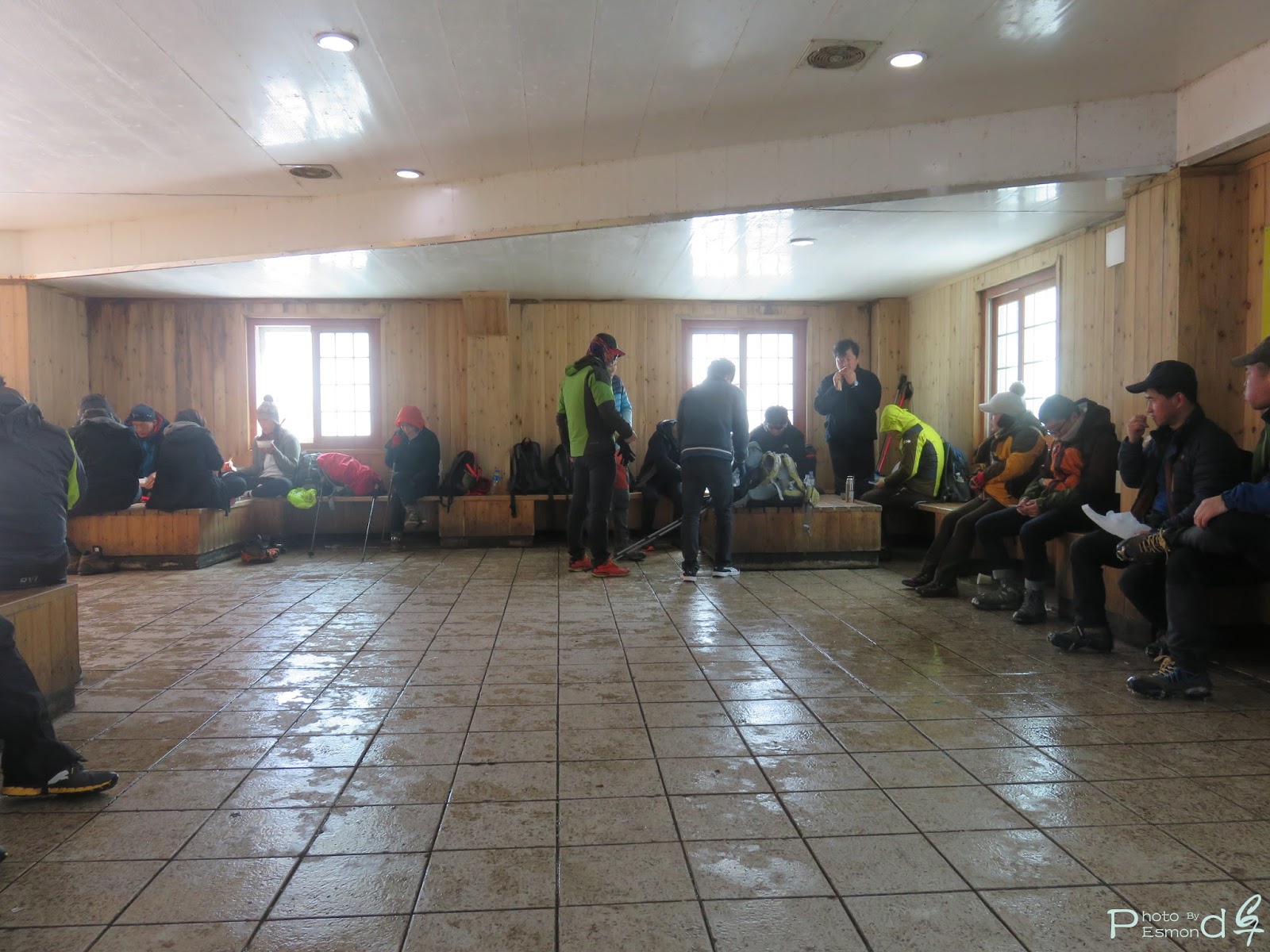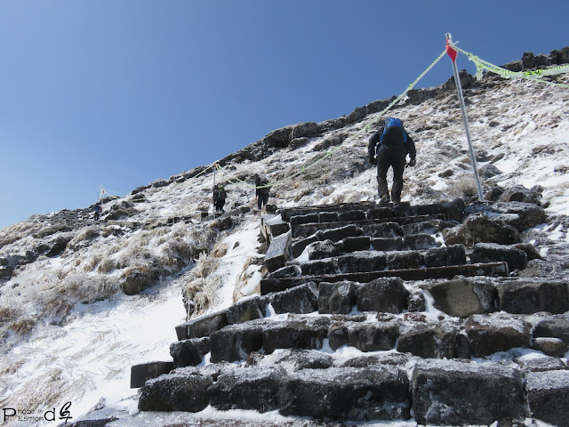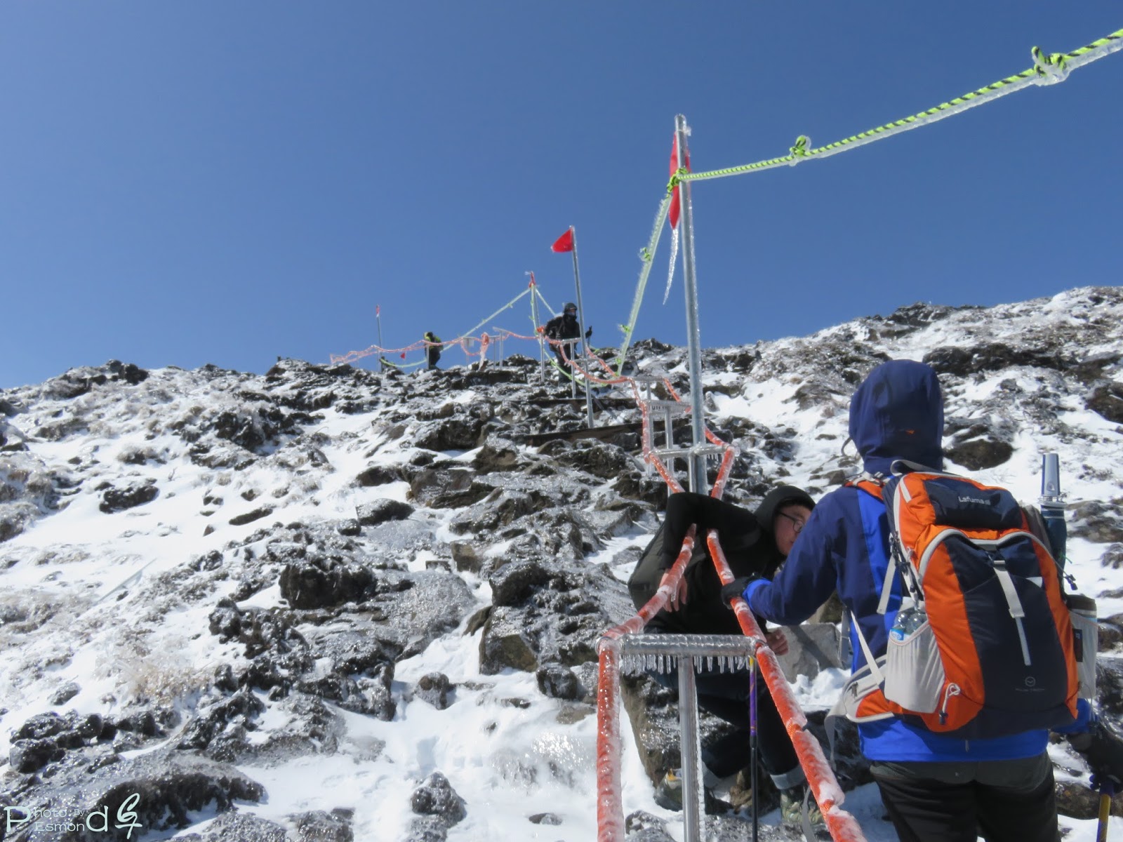 这段路除了结冰外,还有一个令我举步艰难的因素--风、强风。越是靠近山顶,风就越强。我一来因为没有雪爪的关系,本身已经很难在平衡了,再加上一阵阵的强风,我还真的害怕自己会被吹下山。。。很多时候我都直接用手绕着护栏或绳子前行。