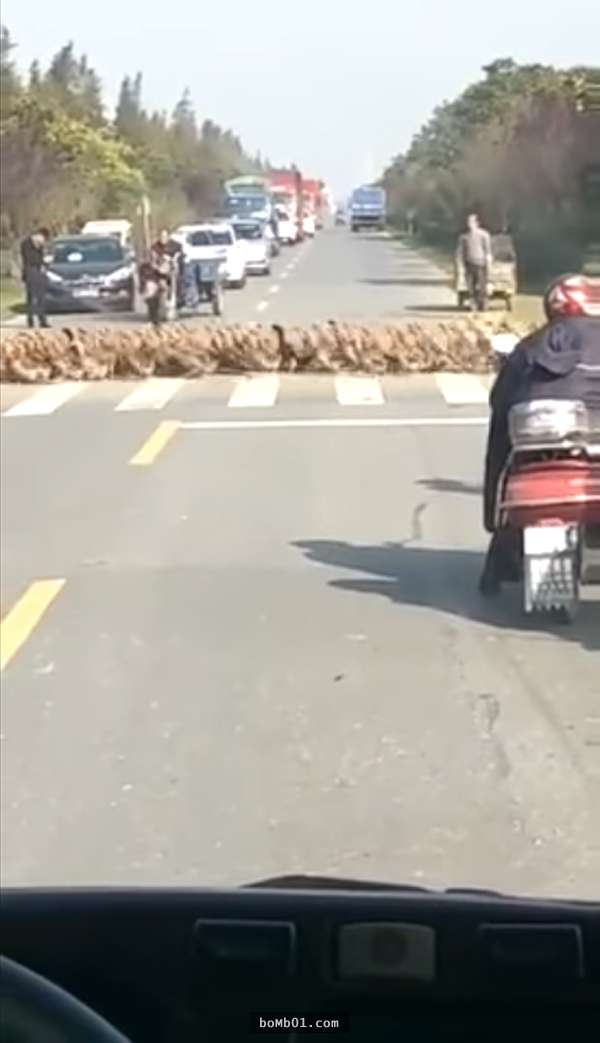 ▼这群鸭子从乡间小路出来,要穿过马路去另一边的树丛。它们规规矩矩走斑马线过马路,没有一只脱队。路边的人觉得很惊奇,忍不住停下车观看这奇景,还有人拿出手机拍摄。