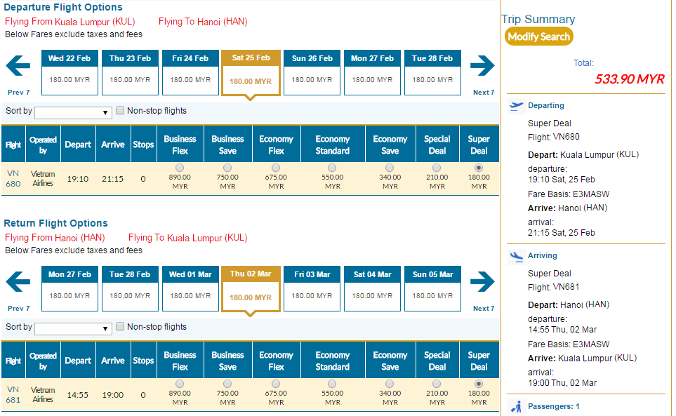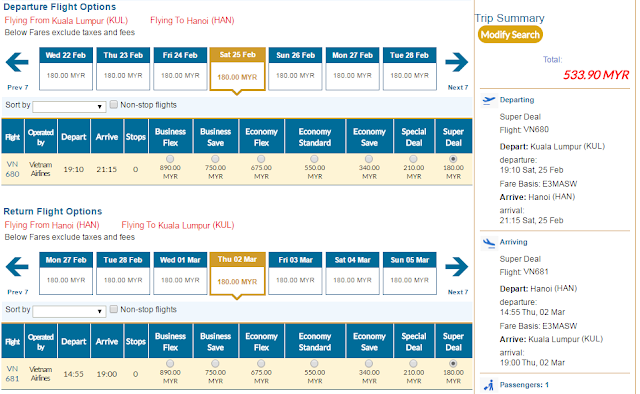 这次的吉隆坡->河内的票价是RM540/人(含税、20公斤机舱行李及餐点)。