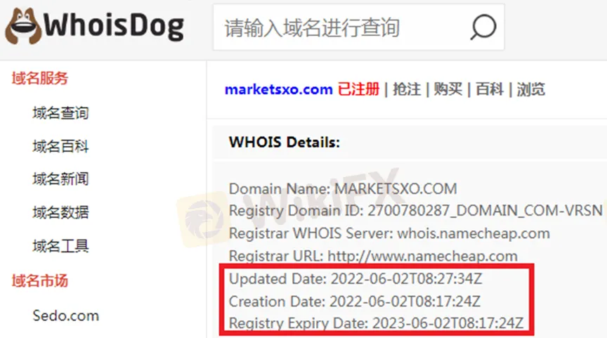 當我們進入Marketsxo的官網查詢更多相關資訊時,看到其公司簡介宣稱擁有專業的技術知識和豐富的資源,可幫助用戶充分發揮潛力,但這些都只是言不及義的廢話,該平台對最重要的監管牌照完全隻字不提。  為了確認這家的安全性,我們使用WhoisDog查詢其官網,結果發現網站是在2022/6/2設立,到現在還不到1年,而且預計將在2023/6/2註冊到期,看起來似乎沒有長期經營的打算,有相當高的詐騙疑慮,因此我們呼籲投資人為確保個人的資金安全,最好盡可能遠離這家交易商。