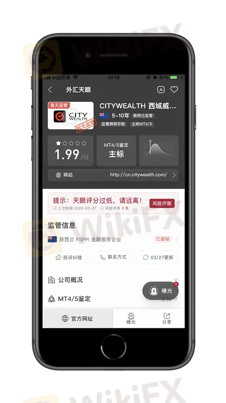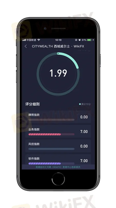 为了让投资者可以对交易商整体状况一目了然,设置了天眼评分系统。在天眼评分系统中,外汇天眼会对交易商的牌照指数、业务指数、风控指数、软件指数和监管指数五大方面进行综合评分。得分越高越值得信赖,越低越需要提高警惕!由于CITYWEALTH · 西城威尔士无任何监管并且未获得监管牌照,所以其牌照指数、风控指数和监管指数均为0分,最终总分仅为1.99分(满分10分)。由于CITYWEALTH · 西城威尔士天眼评分过低,在风险提示栏也明确提示投资者远离!