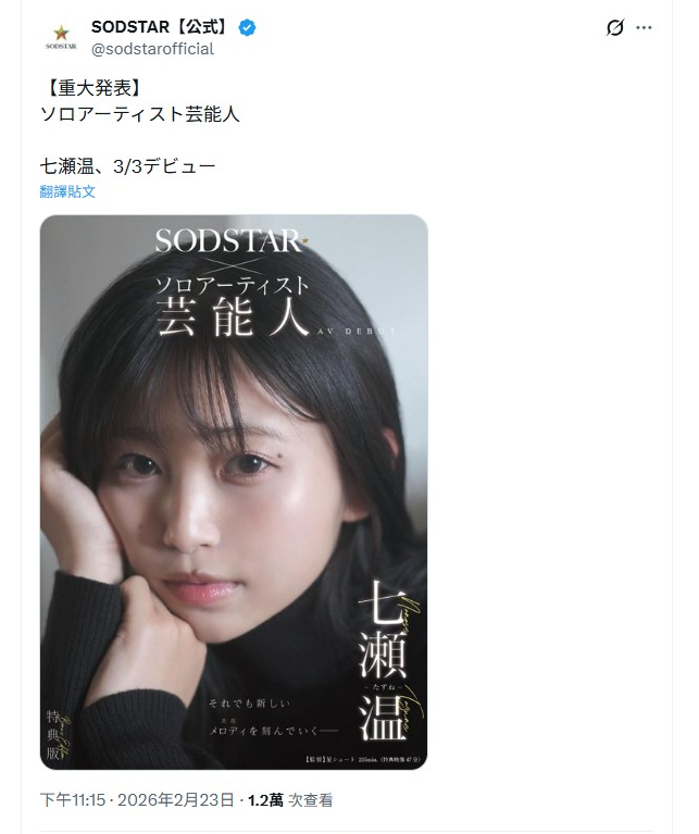 記者陳芊秀/綜合報導 日本AV界再添震撼彈。來自大阪的創作女歌手「温」於昨日(23)透過手寫信宣布,將以「七瀨温」之名正式在AV界出道,消息一出立刻引發外界關注。七瀨温在手寫信中表示,這項決定並非一時衝動,而是經過長時間自我探索後所做出的選擇。她坦言,從十幾歲起便不斷尋找真正的自己,「如今終於能夠正視並看清『真正的自己內心所追求的樣子』」,因此做出了這個決定。 信中提到「為了成為自己所嚮往的模樣,我想在新的領域中表現全新的自己,想要拓展自身的可能性」。儘管明白外界勢必會有各種聲音與看法,但她強調是在充分理解與覺悟之下,投身「影音隨選(On Demand)」這個世界,「我並不是抱著半吊子的心態來到這裡。我是認真且真誠地面對『情色』這種表現形式。」她表示自己學習了身為AV女優的日常,在同人網站上,將自己所思考的「情色=生活的延伸」作為表現來努力學習,並在各種交流之中不斷成長,除了感謝支持的粉絲,今後也會持續學習。片商SOD昨日以「重大發表」的口吻介紹創作歌手七瀨温,並將於3月3日出道。首支作品封面充滿透明美感,她留著一頭黑色長髮,瀏海微微遮住雙眼,營造出神祕且憂慾的氣息,另一張封面則是梳起丸子頭,露出瓜子臉,手搭在吉他上,妝容清淡,搭配「創作歌手出道」的標題,與常見的AV作品時常表現火辣性感的封面,展現出截然不同的風格。